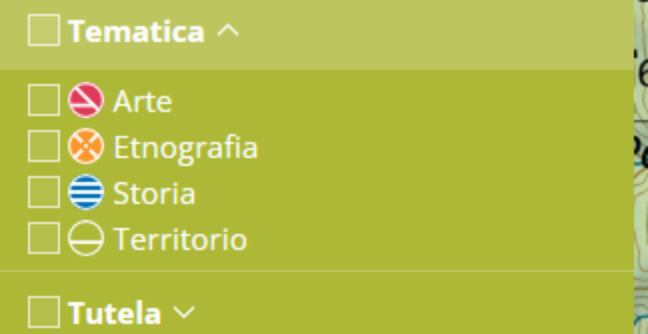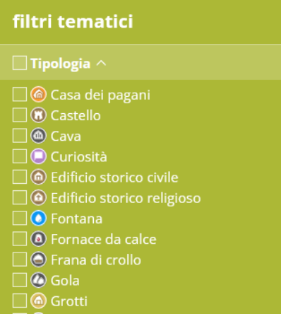 Questo filtro permette di selezionare tutti gli oggetti appartenenti alla stessa tipologia, per esempio i sei castelli, i sedici massi cuppellari, i cinque mulini o gli undici torchi inventariati nel Portale cartografico.