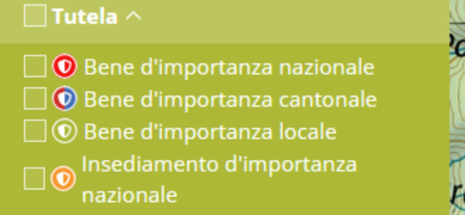 Il grado di tutela permette di selezionare tutti i beni culturali a seconda della loro importanza – nazionale, cantonale o locale – così come gli insediamenti svizzeri da proteggere d’importanza nazionale (ISOS).